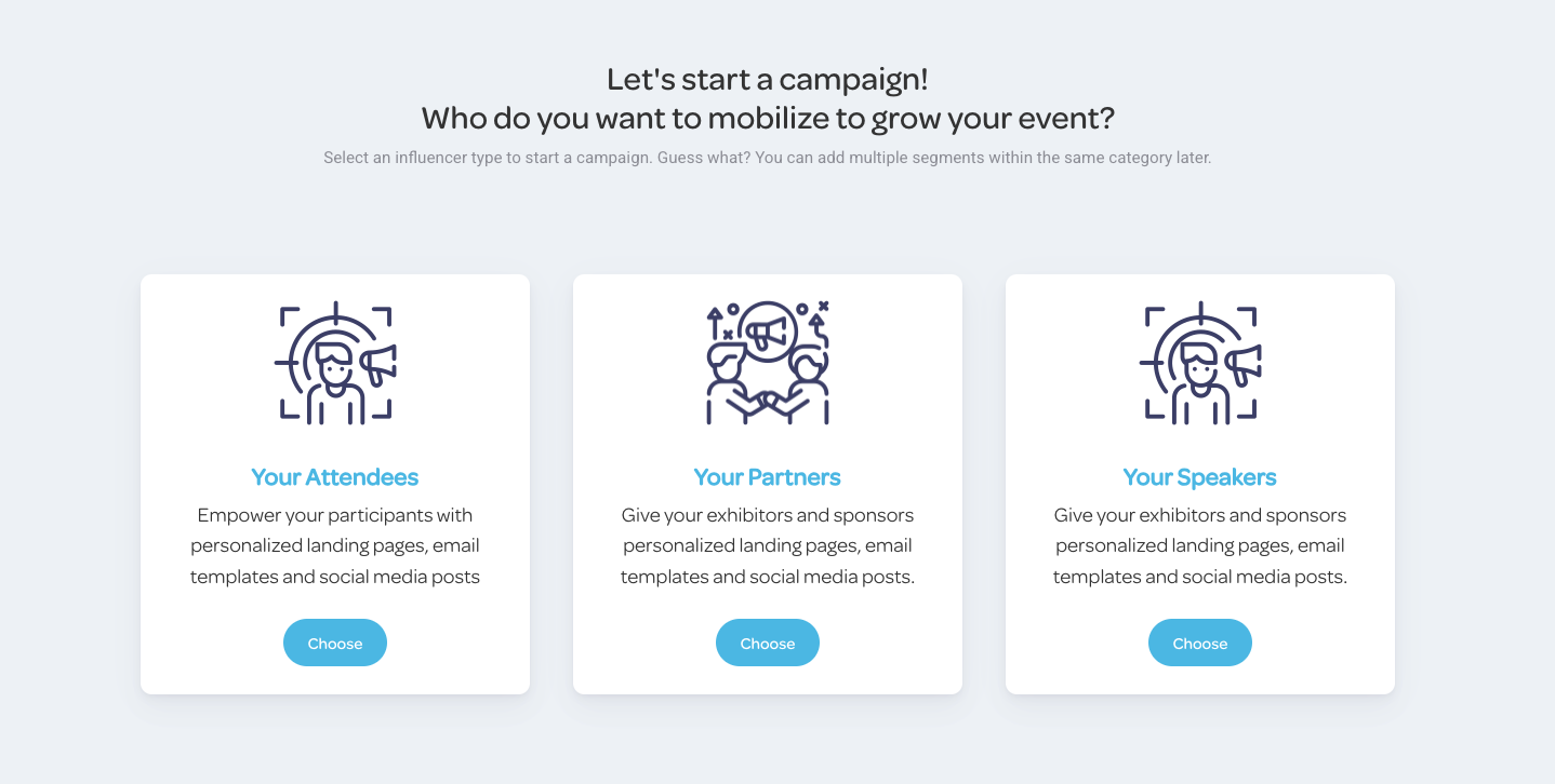Next, choose influencer type - you'll be prompted to select from Snöball's default audience segments, which include Attendees, Partners, and Speakers: