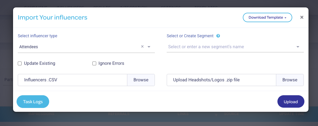 You can access the templates used to upload your influencers here via the Download Template button. The templates for each influencer type are also available here: