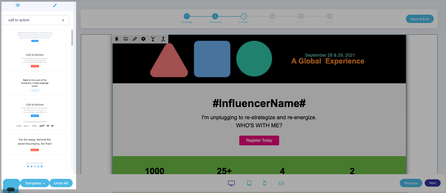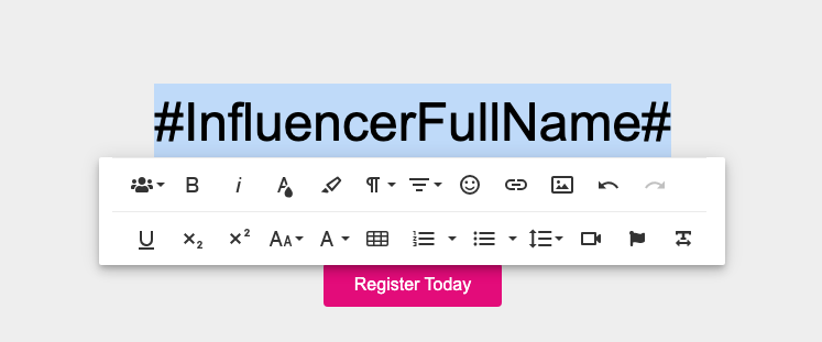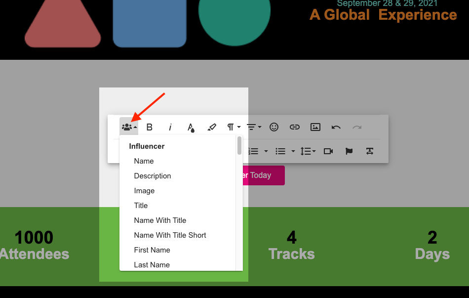 From here you will be able to select a number of variable text elements tied to your influencer, including their name, title, sessions, booth number, and more: