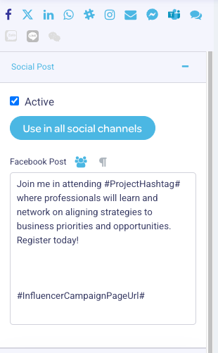 You can add dynamic custom merge fields to the social share screen, which will pull influencer and event information directly into the share message. Dynamic merge fields will appear flanked by a hashtag on either side.