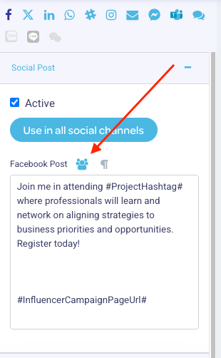 The text editor allows you to tailor the post that will be shared for several social channels, both public and private - select the channel that you want to edit from the top of the list.