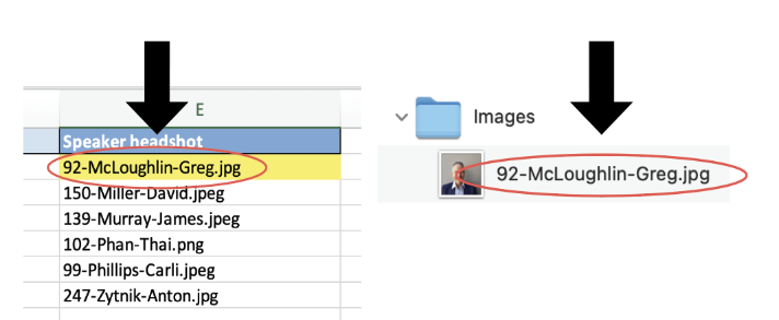 - If adding headshots or logos, make sure that the file name matches exactly the file name of the image, including file extensions.